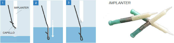 - I capelli sono inseriti ad uno ad uno direttamente nel cuoio capelluto dall’implanter, uno speciale stilo a molla brevettato, che aggancia il capello dall’asola posta alla sua estremità