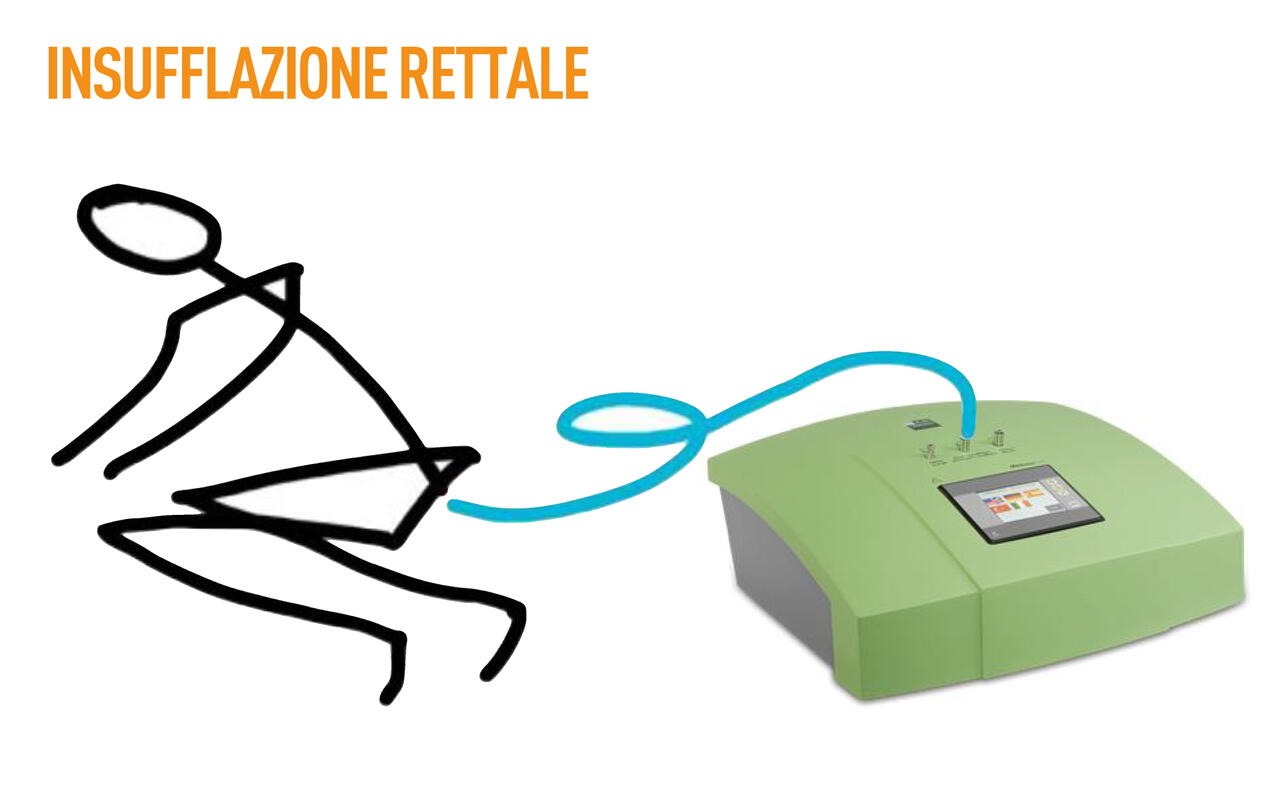 Una certa importanza va attribuita all’insufflazione rettale: tramite un minuscolo catetere ginecologico lubrificato da vasellina pomata, o lidocaina gel LUAN o olio ozonizzato per facilitare l’inserimento nel retto, una miscela gassosa ricca di ozono viene insufflata nell’intestino del paziente. L’insufflazione rettale costituisce un’ottima pratica terapeutica in quanto non è assolutamente invasiva, molto semplice da somministrare ed agisce a livello sistemico. Per tale motivo è divenuta ormai la metodica di elezione per la terapia di molte patologie.