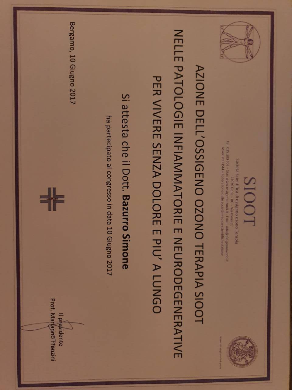 - corso teorico e pratico di ossigeno – ozonoterapia SIOOT, società scientifica di ossigeno ozono terapia, Gorle (BG).
