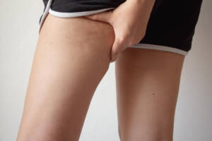 Ora, a livello della coscia, usando il pollice e l’indice, o anche tutte e 2 le mani, premi e pizzica la pelle. Se diventa grinzosa e sentirai delle zone dure e granulose, allora corri al riparo!
